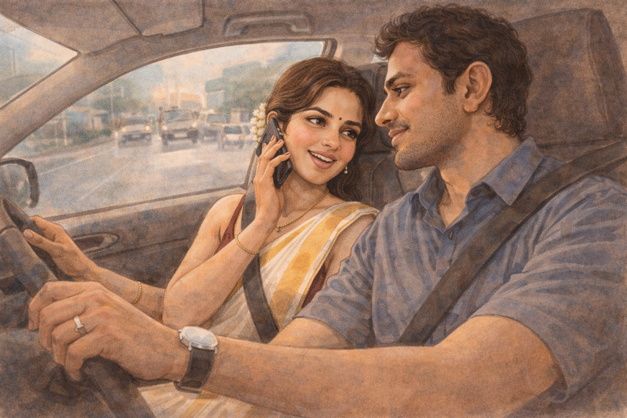 “ഹേയ്, ഇപ്പോൾ എന്നെ ഇങ്ങനെ നോക്കരുത്. നേരെ നോക്കി വണ്ടി ഓടിക്കൂ,” എന്ന് പറഞ്ഞ് അവൾ എന്റെ തോളിൽ ഒന്ന് തട്ടി. പക്ഷേ അവളുടെ ആ നാണം കാണാൻ വേണ്ടി തന്നെ ഞാൻ ഇടയ്ക്കിടയ്ക്ക് അവളെ നോക്കിക്കൊണ്ടിരുന്നു. ഒടുവിൽ അവൾ കള്ളദേഷ്യം നടിച്ച് സൈഡ് ഗ്ലാസിലൂടെ പുറത്തേക്ക് നോക്കി ഇരുന്നു. “ഞാൻ നിന്നെ നോക്കുന്നില്ല, പോരേ?” അവൻ പിണക്കം അഭിനയിച്ചു