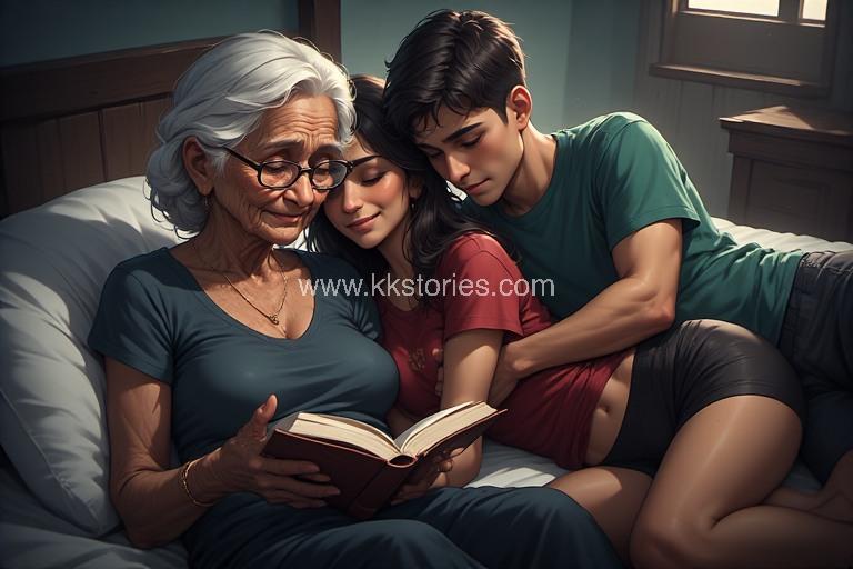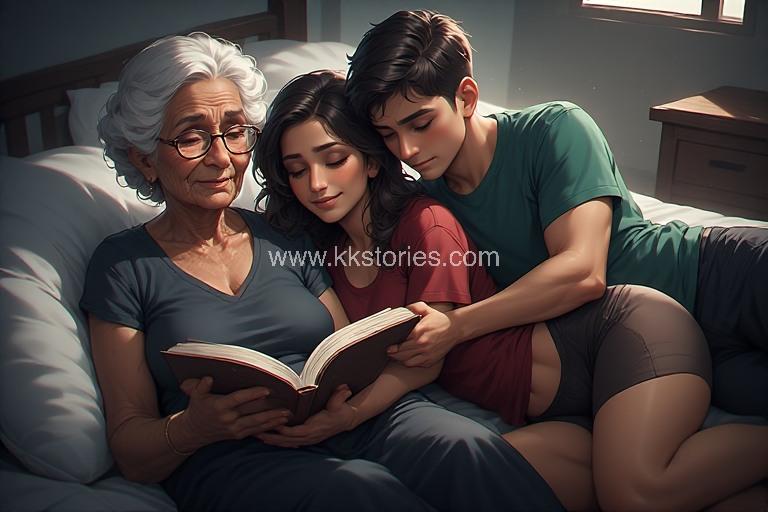 അമ്മൂമ്മ കട്ടിലിൽ ചാരി ഇരിക്കുന്നു. കയ്യിൽ ഒരു പഴയ പുസ്തകം.