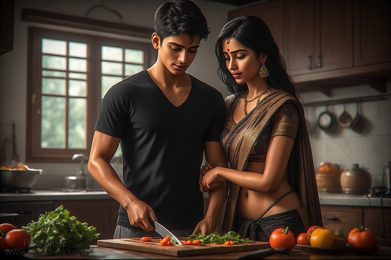 അവൻ രാധയെ പരമാവധി നോക്കാതെ പച്ചക്കറി മുറിക്കാൻ തുടങ്ങി.