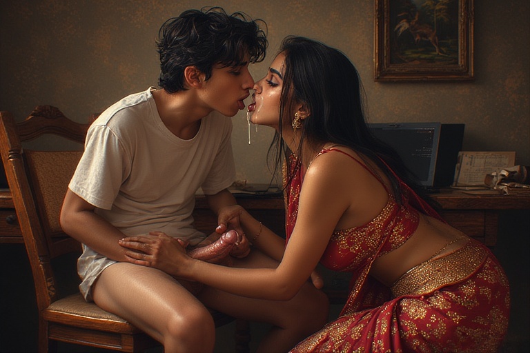 അവൻ എഴുന്നേറ്റ് തന്റെ ഷർട്ടും ഊരി പൂർണ നഗ്നനായി നിന്നു. മുട്ടിൽ ഇരിക്കുന്ന ചേച്ചിയുടെ സാരി അവൻ അഴിച്ചു മാറ്റി.