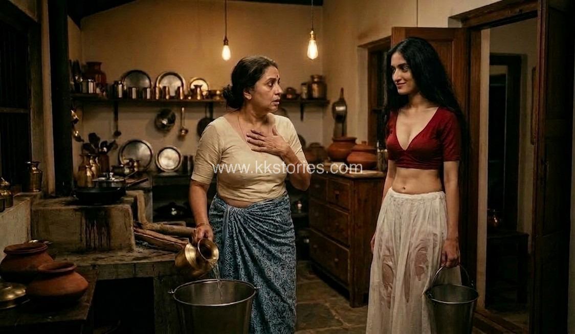 വേഗം കുളിച്ച് ആ പേടിയിൽ നിന്ന് രക്ഷപ്പെടാൻ കരുതി മീര ഒരു ബക്കറ്റുമായി അടുക്കളയിലേക്ക് ചെന്നു. എന്നാൽ അവിടെ കണ്ട കാഴ്ച അമ്മയെ ഞെട്ടിച്ചുകളഞ്ഞു. സാരി മാറി അടിപ്പാവാടയും ബ്ലൗസും മാത്രം ധരിച്ചാണ് മീര നിൽക്കുന്നത്. ആ നിമിഷം അമ്മയുടെ മനസ്സിലേക്ക് അച്ഛന്റെ ആ വിവരണം ഒരു മിന്നൽ പോലെ ഓടിയെത്തി: “നല്ല വെളുത്ത നിറമുള്ള, മെലിഞ്ഞു കൊലുന്നനെയുള്ള പെൺകുട്ടി… ചെറിയ കൂമ്പിയ മുലകൾ… ഒതുങ്ങിയ അരക്കെട്ടും മനോഹരമായ പൊക്കിളും… നീണ്ട മുഖവും കാർകൂന്തൽ പോലെയുള്ള മുടിയും…”
