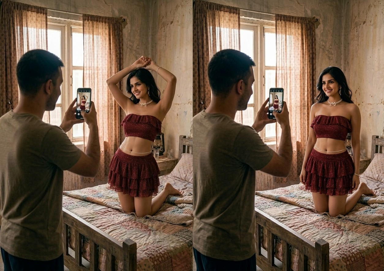 മുറിയിലെ താപനില അല്പം കൂടി ഉയർന്നതുപോലെ മീരയ്ക്ക് തോന്നി. അത് ആ പഴയ വീടിന്റെ ചൂടായിരുന്നില്ല, മറിച്ച് അർജുന്റെ നിർദ്ദേശങ്ങളും അവളുടെ ഓരോ ചലനവും സൃഷ്ടിച്ച വശ്യമായ അന്തരീക്ഷത്തിന്റേതായിരുന്നു. അർജുൻ ഒരു പ്രൊഫഷണൽ ഫോട്ടോഗ്രാഫറുടെ ഗൗരവത്തോടെ ഫോൺ ക്യാമറ ലക്ഷ്യസ്ഥാനത്ത് ഉറപ്പിച്ചു.