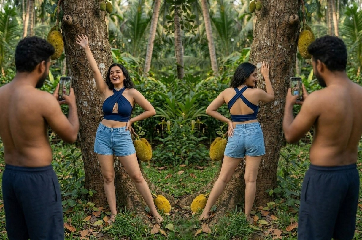 അർജുന്റെ ചോദ്യം കേട്ട് മീര അവനെ ഒന്ന് തുറിച്ചു നോക്കി. എങ്കിലും അവളുടെ ചുണ്ടിൽ ഒരു ചിരി വിരിഞ്ഞു. അവൾ തന്റെ ആ ചെറിയ പാവാടയുടെ അറ്റങ്ങളിൽ വിരൽ കോർത്തു. വരാനിരിക്കുന്ന അടുത്ത ക്ലിക്കുകൾക്കായി അവൾ സ്വയം തയ്യാറെടുത്തു. മീര അർജുനെ ഒന്ന് തുറിച്ചു നോക്കിയെങ്കിലും അവളുടെ ഉള്ളിലെ കുസൃതി അപ്പോഴേക്കും ഉണർന്നിരുന്നു. പഴുത്ത ചക്കകൾ തൂങ്ങിക്കിടക്കുന്ന ആ പ്ലാവിൻ ചുവട്ടിൽ, ഉച്ചവെയിലിന്റെ സ്വർണ്ണപ്രഭയിൽ അവൾ ഒരു ദേവതയെപ്പോലെ തിളങ്ങി.