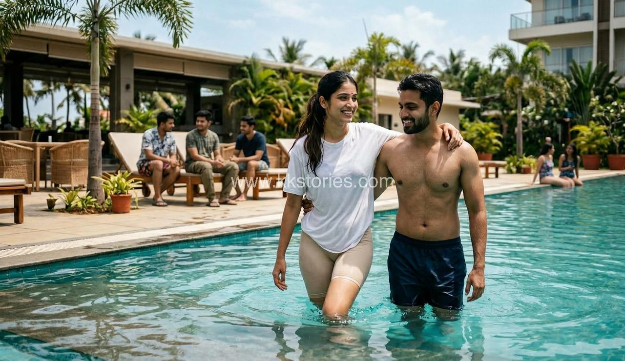 ഉച്ചവെയിലിന്റെ സ്വർണ്ണനിറം പൂളിലെ തെളിനീരിൽ പ്രതിഫലിക്കുന്നുണ്ടായിരുന്നു. മീര പടവുകൾ ഇറങ്ങുന്നത് അർജുൻ നോക്കി നിന്നു. അവൻ തന്നെ അവൾക്ക് നൽകിയതാണ് ആ നേരിയ വെള്ള ടി-ഷർട്ടും സ്കിൻ കളർ സ്കിൻ-ഫിറ്റ് ഷോർട്ട്സും. വെള്ളത്തിൽ ഇറങ്ങിയതോടെ നനഞ്ഞു കുതിർന്ന വസ്ത്രങ്ങൾ അവളുടെ ശരീരത്തോട് ഒട്ടിപ്പിടിച്ചു. അടിയിൽ വസ്ത്രങ്ങളൊന്നും ധരിക്കാതിരുന്നതിനാൽ, വെള്ള ടി-ഷർട്ടിനുള്ളിലൂടെ അവളുടെ മുലകളുടെ ആകൃതി വ്യക്തമായി പുറത്തുകാണാമായിരുന്നു. സ്കിൻ കളർ ഷോർട്ട്സ് ആയതിനാൽ ഒറ്റ നോട്ടത്തിൽ അവൾ അടിയിൽ ഒന്നും ധരിച്ചിട്ടില്ലെന്നേ തോന്നൂ.