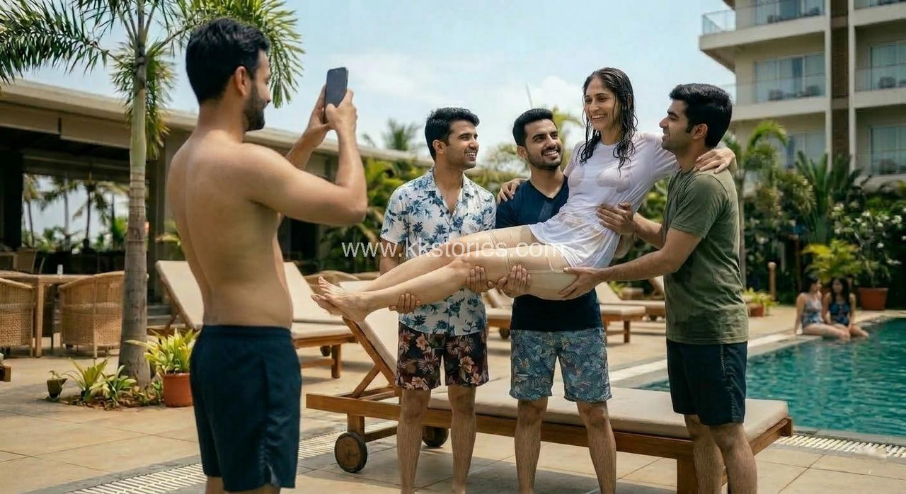അർജുൻ ക്യാമറ റെഡിയാക്കി. പിന്നെ നടന്നത് ആ പയ്യന്മാരുടെ സ്വപ്നതുല്യമായ നിമിഷങ്ങളായിരുന്നു. മൂന്ന് പയ്യന്മാരുടെയും നടുവിൽ മീര നിന്നു. ഇരുവശത്തുമുള്ളവർ അവളുടെ ഇടുപ്പിലൂടെ കൈകൾ ചുറ്റി അവളെ തങ്ങളിലേക്ക് ചേർത്തുപിടിച്ചു. അവരുടെ കൈപ്പത്തികൾ അവളുടെ നനഞ്ഞ ഷോർട്ട്സിന് മുകളിലൂടെ ആ വിരിഞ്ഞ ഇടുപ്പിൽ അമർന്നു. മീര തന്റെ കൈകൾ അവരുടെ തോളിൽ ഇട്ട് ചിരിച്ചു. അർജുൻ ആ ദൃശ്യം ക്യാമറയിൽ പകർത്തി.