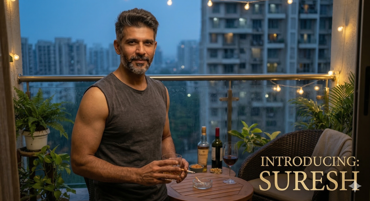 അവിടെവിടെയായി നരച്ചു തുടങ്ങിയ ആ ‘സാൾട്ട് ആൻഡ് പെപ്പർ’ സ്റ്റൈൽ അവന് ഒരു മാന്യതയും മച്യൂർ ലുക്കും കൂടി കൊടുക്കുന്നുണ്ട് — ചിലപ്പോൾ ഒരു മിലിന്ദ് സോമൻ ഫീൽ ഒക്കെ വരും. അധികം സംസാരിക്കാത്ത കൂട്ടത്തിലാണ്, പക്ഷേ കാര്യങ്ങളൊക്കെ ശ്രദ്ധിച്ചു നോക്കി, മനസ്സിൽ വെച്ച് വിശകലനം ചെയ്യുന്ന തരം. ഓഫീസിലെ ചെറിയ സിഗരറ്റ് ബ്രേക്കുകൾ, വീക്കെൻഡുകളിൽ ബാൽക്കണിയിൽ ഇരുന്ന് രണ്ടു പെഗ് വിസ്കി — ഇതൊക്കെയാണ് അവന്റെ ദിവസത്തിലെ ചെറിയ ചെറിയ സന്തോഷങ്ങൾ.