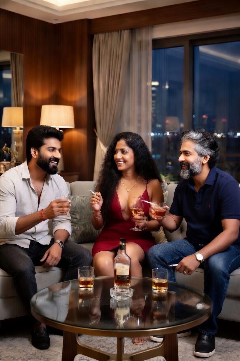 അവർ മൂന്നുപേരും ഹാളിൽ ഇരുന്നു സംസാരിച്ചു തുടങ്ങി. രേവതി ഒരു സോഫയിൽ സുരേഷിനും ഉണ്ണിക്കും അഭിമുഖമായി കാലുകൾ പിണച്ചുവെച്ചാണ് ഇരുന്നത്. ഓരോ തവണ അവൾ ചലിക്കുമ്പോഴും ആ സ്ലിപ്പ് ഡ്രസ്സ് അവളുടെ തുടകളിലൂടെ മുകളിലേക്ക് വഴുതി മാറുന്നുണ്ടായിരുന്നു. ഉണ്ണി തന്റെ ഗ്ലാസ്സിലെ വിസ്കി കുടിക്കുമ്പോഴും അവന്റെ ശ്രദ്ധ മുഴുവൻ രേവതിയുടെ നഗ്നമായ ആ തുടകളിലായിരുന്നു. അവൻ തന്റെ വിരലുകൾ ഗ്ലാസ്സിൽ അമർത്തി, നെറ്റിയിൽ വിയർപ്പ് പൊടിഞ്ഞു. സുരേഷ് ഇത് ശ്രദ്ധിക്കുന്നുണ്ടായിരുന്നു.