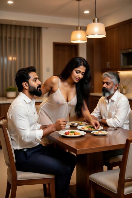 അവൾ കുനിയുമ്പോഴും തിരിയുമ്പോഴും ഉണ്ണി അവളെ വല്ലാത്തൊരു ദാഹത്തോടെ നോക്കുന്നത് സുരേഷ് ശ്രദ്ധിച്ചു. സുരേഷിന്റെ കുണ്ണ ടേബിളിന് താഴെ മുറുകാൻ തുടങ്ങി, അത് മറയ്ക്കാൻ അവൻ വല്ലാതെ കഷ്ടപ്പെട്ടു. അവർ സംസാരിക്കുന്നുണ്ടായിരുന്നുവെങ്കിലും സുരേഷിന്റെ മനസ്സ് മുഴുവൻ കിച്ചണിലെ ആ സീനിലായിരുന്നു.