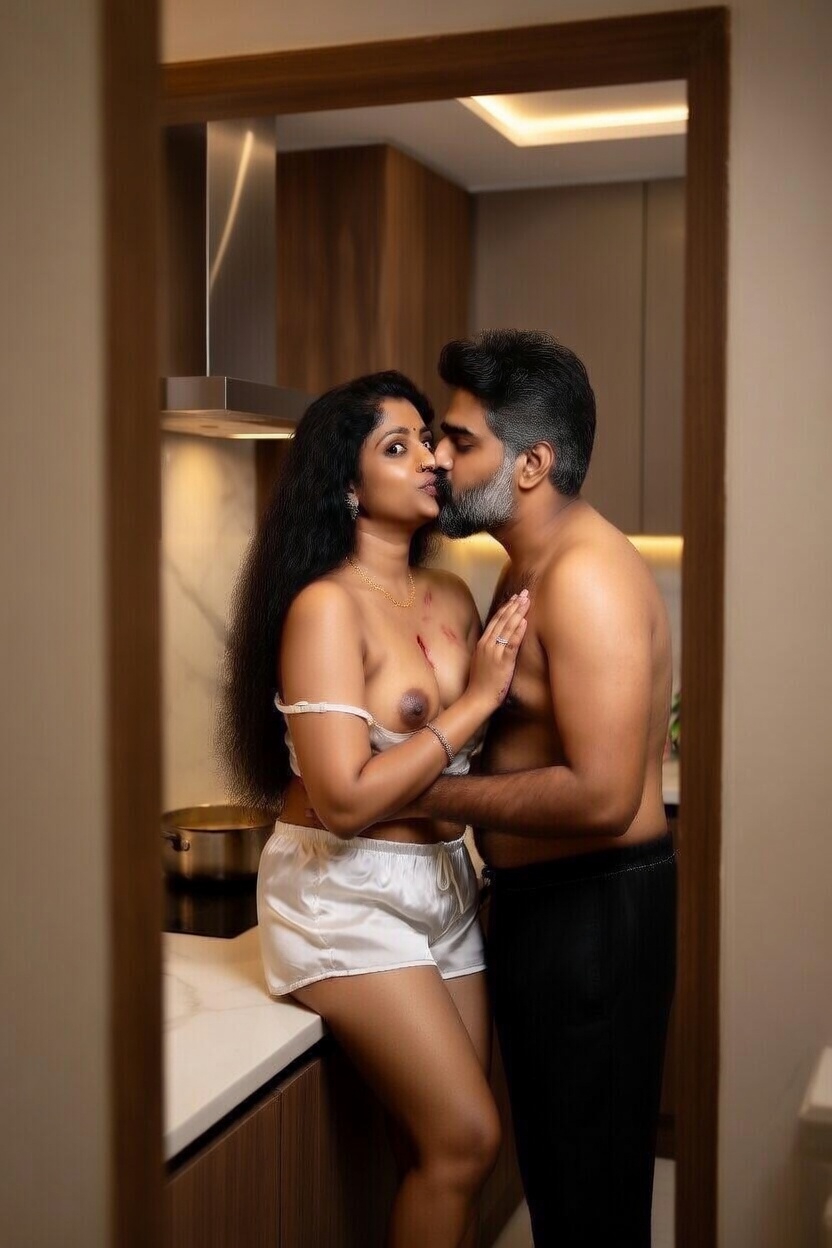 സുരേഷ് അവളെ പൊക്കി കിച്ചൻ ടാബിളില് ഇരുത്തി പരുപടി തുടരുന്നു. അവന് അവളുടെ മുളകളക്കിടയിൽ മുഖം പൂഴ്ത്തി ആഞ് മണത്തു. അതേ അവന് മറ്റൊരാളുടെ വിയറപ്പിന്റെ ഗന്ധം കിട്ടുന്നു. അവളും അവന്റെ തല തന്റെ മുലകളില് അമർത്തടി പിടിച്ചു. അവളുടെ കണ്ണുകള് ഒരു നിമിഷം ഹാളിലേക്ക് പോയി, അവളെ ഞെട്ടിച്ച കൊണ്ട് ഉണ്ണി അവിടെ നിന്നും അവരെ നോക്കുന്നുണ്ടായിരുന്നു.